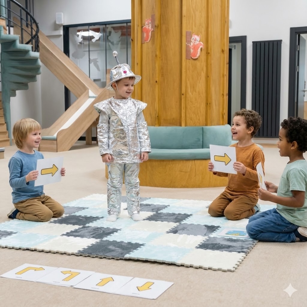 Bu oyunda robot çocuklar oluyor! Bir öğrenci "robot" rolüne girip mat üzerinde hareket ederken, arkadaşları ona yön komutları verir. Oyun ve hareketin birleştiği bu atölyede kahkahalar eksik olmaz.